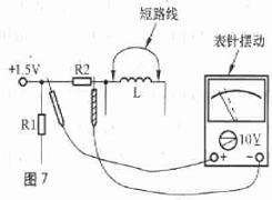 1. 首先检测电路是否起振 调试时,如图7所示,将万用表置“直流10V”挡,去测量电阻R2上的压降,这时,如用一短路线将振荡线圈L短路,万用表表针应有明显摆动,说明电路已起振。如电路不起振.应检查:电路板有无虚焊,两晶体管放大倍数是否一致,C2等元件是否完好等等,必要时可适当调节R2的阻值太小使电路起振。