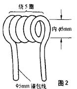 二、元器件选择与自制 选频回路中的电感L需自行绕制,如图2所示,用直径0.5mm的漆包线,在直径5mm左右的骨架上绕制5圈,抽去骨架成为空心线圈,并适当拉长即可。