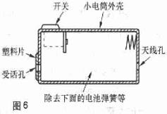 制作机壳。 双管调频无线话筒的外壳可用一只长方形塑料小电筒改制,如图6所示,将塑料小电简外壳内下面一半的电池弹簧和小电珠除去,保留上面一半的电池弹簧和开关。在小电筒头部原小电珠发光的开口处,粘上一片塑料片,并在其上钻一个受话孔。在小电筒尾部钻一个小孔作为天线引出孔。