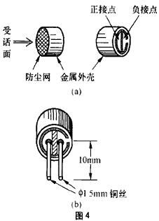 安装元器件 各器件在电路板上的位置如图3所标示 按图将除驻极体话筒外的各元器件焊入电路板铜箔面的相应位置。安装焊接时,应注意控制元器件的高度,晶体管引脚可剪短,阻容元件采用卧式安装,元器件在电路板上的安装高度不应超过10mm。 安装驻极体话筒。 驻极体话筒如图4所示,上面有防尘网的一面是受话面。话筒底部有两个接点:与金属外壳相连的是负接点,使用中应接地或接电源;四周悬空的是正接点,接信号端。制作时,用两截直径1.5mm、长10 mm左右的粗铜丝,焊牢在话筒底部的两个接点上(见图4b),既是引线,又作支架。然后将其焊入电路板左端相应位置,话筒的受话面应指向左端,井与电路板平面平行,如图5左侧所示