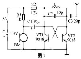 本文介绍的调频无线话筒具有工作稳定、声音清晰、简单易制、功耗较小的特点。发射半径大于20m,使用一节5号电池,能连续工作较长时间。 一、电路工作原理 调频无线话筒整机电路如图1所示,虽然电路十分简洁,仅用了10个元器件,但仍包括了音频电路和高频电路两部分。 1.音频接收放大电路。 由驻极体话筒BM、负载电阻R1和耦合电容C1等组成,其功能是拾取声音转换为电信号并进行音频放大。驻极体话筒内部有一个场效应管作信号放大,因此拾音灵敏度较高,输出音频信号较大。声音信号引起的驻极体话筒内部场效应管漏极电流的变化,通过负载电阻R1得到相应的电压信号,经耦合电容C1输出至高频振荡电路。 2.高频振荡调制电路。 由晶体管VT1和VT2、电阻R2、电感L、电容C2和C3等组成,其功能是产生高频载波并进行调制发射。L与C2构成LC谐振回路,该回路具有选频作用,两个晶体管VT1、VT2的集电极与基极互相交叉连接,并与L、C2选频回路组成高频振荡器。经C1耦合过来的音频信号加在VT1集电极(也就是VT2基极),对高频振荡信号进行频率调制,调制后的调频信号经C3耦合至天线辐射出去。发射频率取决于LC谐振回路谐振频率,调节L或C2的大小即可改变发射频率。