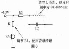 2.调整发射频率 加图8所示,用一调频收音机接收无线话筒的信号,通过调节振荡线圈L的匝间距离,使发射频率落在88~108 MHz的调频频段内,如欲提高发射频率,应增大L1的匝间距离;如欲降低发射频率,应缩小L的匝间距离。应注意使调频收音机能在无广播电台处接收到无线话筒的信号.这样可避开广播电台的干扰。