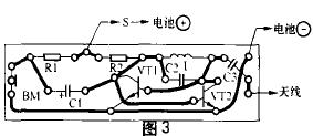 晶体管VT1、VT2选用9018或其他fT≥700 MHz的NPN型超高频管。C2、C3选用高频瓷介电容器。其他元器件无特殊要求。 三、制作 可按以下步骤进行制作: 制作电路板。 整机电路安装在一块15mm x 55mm的小电路板上,如图3所示,用单面敷铜板制成,元器件可直接焊接在电路板铜箔面,因此电路板上不必钻孔。