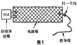 安装天线。 本机采用一截40~50cm长的软导线作为天线,将软导线的一端焊入电路板右端相应位置,并在靠近电路板处打一个结(电路板装入机壳后可防止天线被拉脱),另一端悬空,如图5右侧所示。