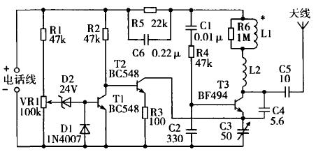 该电话无线发生器电路简单实用,能将双方通话内容发射到空中,可由无线接收机接收。电路原理如附图所示。 该发射器由自动开关和调频发射机两部分组成。自动开关部分由R1~R3、微调电位器VR1、晶体管T1、T2、稳压管D2和二极管D1等组成。R1与VR1组成分压器,当电话线的直流电压为48V时,VR1的输出电压为0~32V。电路工作状态的转换取决于稳压管D2的击穿电压(此处为24V) 与T1的导通电压(0.7V),因此将VR1的输出调至24.7v时,就会使D2击穿和T1导通,此时T1的集电极电位降低,T2截止。若拿起电话机的手柄,则电话线电压降到约11V,T1截止,T2导通,T3直流通路得以形成,电路起振。 小功率调频信号发射器由晶体管T3、线圈L1等组成,T2起电子开关(接通/断开)的作用,电话线上的音频信号沿晶体管T2及串联电阻R3,对振荡频率进行调制,调制后的高频信号送到天线发射。只要调频接收机调谐到调频发射器的发射频率,就能听到双方的通话。 L1用SWG36号漆包线在1MΩ、1W 的电阻上绕45匝,L2为直径12mm的空心线圈,用SWG21号漆包线绕3匝。 该电路的直流电源取自电话线,无需外接电源,由于电路耗电很小,不影响电话的正常工作。该发射器调试完毕后,可装在3.75×5cm的盒内。