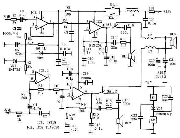本文介绍一种用于汽车最佳而有趣的高质量音频功率放大器结构方案,以最低的花费就能实现,而且该方案同样可用于小型便携式音乐中心。该功率放大器的特点是低通道没有附加另外的放大器,低频通道的扬声器经滤波器接到二个立体声通道的输出端,其中一个信号反相,因而构成桥式连接电路,在低电压供电的情况下,压缩型低频公共扬声器上可以获得足够的功率。 电路原理: 音频功率放大器电路如图一所示,双运放大器IC1 LM358构成前置放大器,它的一半在左声道工作于反相状态,而另一半在右声道工作于同相状态,前置放大器的放大倍数等于1,除了使信号在其中一声道反相外,它还提供功率放大器IC2 和IC3 集成电路TDA2030输入端的偏压。为了使功放放大器输出端在电源电压接通后直流电压平稳缓慢增大,消除接通电源瞬间产生的“喀啦”声,在电路中引入了消“喀啦”声电路R6、C5,电源接通时,C5 上的电压是缓慢增长的,不会使输出产生“喀啦”声。二极管VD2 用于电源断开后电容C5 快速放电,稳压管VD1 用于功率放大器输出端的直流电压,因而供电回路的波动不会影响声频放音的质量。该电路的另一特点可以工作在普通单通道状态,例如收听语言节目,在这种情况下降低了消耗功率,提高了被放大信号的下限频率。同时用开关SA1 断开扬声器BL3 及滤波器,而扬声器BL1、BL2 经过电容器C16、C17 连接,减弱了低于 100Hz~150Hz 频率的信号。BL1、BL2 扬声器也经过R17、C14 和R18、C15 连接,使高于 300Hz 频率的信号通过。 声频功率放大器的参数如下:(1)放音频率(-3dB 电平)的额定范围为25~22000HZ;(2)立体声道的有效功率为5.5W × 2;(3)低频道的有效功率为22W;(4)额定输入电压0.25V;(5)在额定输入电压时谐波系数为0.12%;(6)电压放大系数为26dB;(7)静态电流120mA~150mA;(8)电源电压为11.7~14.4V。 该声频功率放大器的最大一个特点是它的接通方式,这种接通方法是借助于二个电磁继电器K1和K2 在“K”端子当电源加上时二个继电器经电容器C22 和C23 并联接通,电容器充电之后继电器绕组经二极管VD3 串联接通,这样可以减少流过继电器绕组的消耗电流,改善了功率放大器的温度状况。