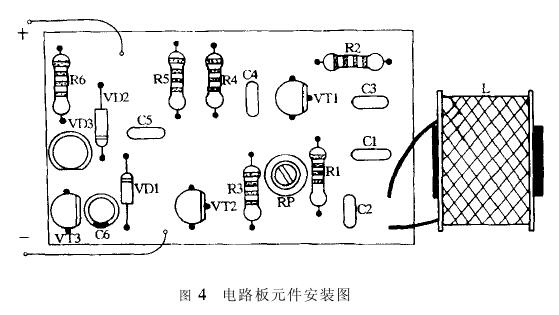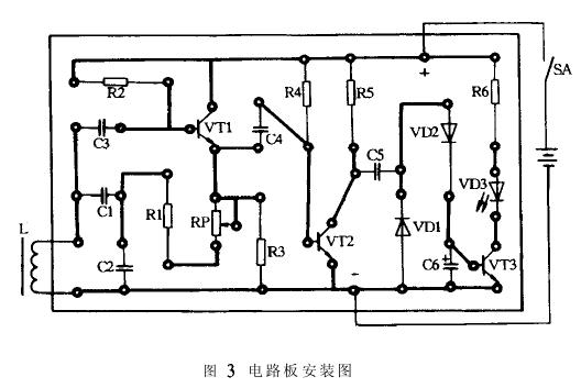二、电路的制作与调试 图2是金属探测器电原理图,图3是它的电路板安装图,图4是它的电路板元件安装图。组装前将所用元器件的管脚引线处理干净并镀上锡。对照三个图,依次将电阻器、二极管、电容器、三极管、发光二极管、微调电阻器焊到电路板上,再将电感探头、开关、电池夹连接到电路板上。电路装好,检查无误就可以通电调试。接通电源,将微调电阻器RP的阻值由大到小慢慢调整,直到发光二极管亮为止。然后用一金属物体接近电感探头的磁心端面,这时发光二极管会熄灭。调整微调电阻器RP可以改变金属探测器的灵敏度,微调电阻器RP的阻值过大或过小电路均不能工作。如果调整得好,电路的探测距离可达20mm。但要注意金属探测器的电感探头不要离元器件太近,在装盒时不要使用金属外壳。必要时也可以将金属探测器的电感探头引出,用非金属材料固定它。