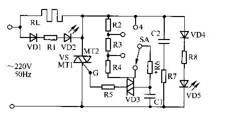 本电火锅功率调节电路,可获得四挡火力,用以适应不同火候的要求。 电路工作原理 电路原理图如图1所示。调节波段开关SA的挡位,可以改变电容C1的充放电速率。利用C1两端交流电压通过双向触发二极管VD3去触发双向晶闸管VS导通、并改变了VS的导通角,使负载RL两端交流电压随之发生变化。 发光二极管VD2、VD5作为信号指示,由于导通角不同,发光亮度各异。SA置于“1”挡,VD5显示;SA置于“4”挡,则VD2显示;R5是限流电阻,用来保护VS。电阻R7、电容C2为吸收回路,用来吸收SA在选挡时所产生的干扰脉冲,否则在SA选挡过程中将对电视机、音响及其他电声器件产生一定的干扰; 元器件选择 电容C1选用0.1uF/160V,C2选0.022uF/400V(涤纶电容器)。电阻R1为56kΩ、1/2W,R2为39kΩ、1/4W,R3为27kΩ、1/4W,R4为2kΩ、1/4W,R5为47Ω、1/2W,R6为100kΩ、1/2W(可变),R7为300Ω、1/4W,R8为43kΩ、1/2W。二极管VD1、VD4用1N4004。发光二极管VD2用BT104(黄色),VD5用BT103(绿色)。触发二极管VD3为DB3或VR60。双向晶闸管V5用TLC226B(3A/400V)或TLC336A(3A/600V)。波段开关SA用KZX-1-2D-11W。负载RL为交流220V/300W(电炉丝)。 制作方法与使用说明 本电路的核心器件是双向晶闸管,因此一定要对其质量进行检测。由于电路简单可自行设计印制电路板。只要按图连接无误,不用调试便可工作。