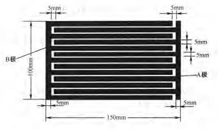 1. 将环氧树脂敷铜板用腐蚀法或用刀刻法刻划出梳状电极板,其尺寸为150mm×100mm,外形状如图2所示。A板和B板不能有任何短路现象。(对于业余者制作电极板其间隔距离均为5mm,以防制作粗造。对于专业制作电极板其间隔2.5-3mm即可。)在电极板的同极性金属线焊几根大头针,以便插放蟑螂的诱饵。