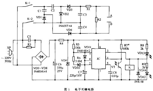 本电子灭蟑电路主要是由两大电路所组成,电路原理如图1所示。主电路由电容C1-C4、二极管VD1-VD4组成的高压电路。A、B两端通过常闭触点K-1、K-2直接接在220V交流电源上。当B端为正半周、A端为负半周时,主流电通过二极管VD1对电容C1充电,这时电容C1的两端电压VC1=√2×220v。当A为正半周,B为负半周时,交流电通过二极管VD4再加上电容C1上的电压对电容C4充电,使得电容C4上的电压为二倍交流峰值。同理,电容C3上的电压为负的二倍交流峰值。因此,在A、E两端可得到电容C3、C4的叠加电压,即4倍的交流峰值,则可产生大于1000V的直流高压。所以,利用220v的电源通过升压整流电路可将电压提高到直流1200v左有。当继电器K释放时,电阻R1和R2为电压板上提供泄放电流回路。 副电路是由电源部分、定时部分、光控部分所组成。接通220v交流电,由电容C5降压,二极管VD5-VD8组成的桥式整流,电容C6、电阻R4、稳压二极管VD9组成的滤波、稳压电路,为时基集成电路IC的8脚与1脚间提供10-12v的直流稳压电源。由集成电路IC、电阻R5、R6、二极管VD10、VD11、电容C7组成的定时电路。通电时,直流电源通过电阻R5,二极管VD11对电容C7充电,当电容C7两端电压达到2/3电源电压时,IC被复位,3脚输出低电位,发光二极管VD13燃亮,继电器K不动作,触点K-1、K-2断开,无高压输出。此时,C7中的电荷通过二极管VD10、电阻R6,经IC 7脚的内部放电管泄放,使电容C7两端电压下降,当电容C7两端电压下降到1/3电源电压时,IC处于置位状态,3脚输出高电位,发光二极管VD14燃亮(VD13熄灭),继电器K通电吸合,触点K-1、K-2闭合,高压电路工作。这时,如有蟑螂爬上电极板,即被杀死。当电容C7放电到一定的电压时,电源电压又开始对电容C7充电,重复上述过程。 其中,调整电阻R5和电阻R6,则可分别调整充放电时间。由图1给出的参数值可知,每隔10-15分钟,A、B两端便可通电一次,每次通电时间3秒左右。因而,保证一批批地杀死蟑螂。当IC的5脚不接外加电压时,通常接入0.01-0.1 uF的电容至地,以防止外界的信号干扰。 一般光线亮时,蟑螂很少出来活动,因此可不必加压。这可由光电三极管VT来控制。无光照时,光电三极管VT呈高电阻,经与电阻R7分压,IC的复位端4脚为高电位,定时电路正常工作。有光照时,光电三极管VT呈低阻,分压电路的4脚为低电位,4脚强行复位,3脚输出低电位,继电器K失电释放,无高压输出。