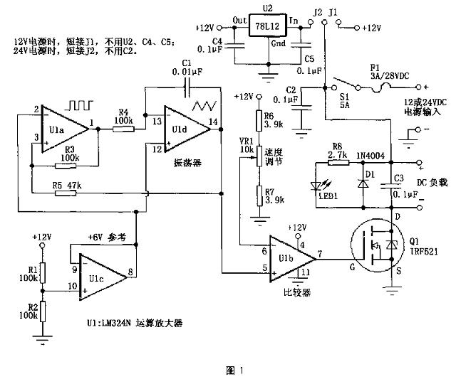 当使用24v的电源电压时,图1电路通过U2将24V转换成12V供控制电路使用。而Q1可以直接在21v电源上,对于Q1来讲这与接在12v电源上没有什么区别。参考图1,改变J1、J2的接法可使电路工作在不同电源电压(12V或24V)下。当通过Q1的电流不超过1A时,Q1可不用散热器。但如果Q1工作时电流超过1A时,需加装散热器。如果需要更大的电流(大于3A),可采用IRFZ34N等替换Q1。