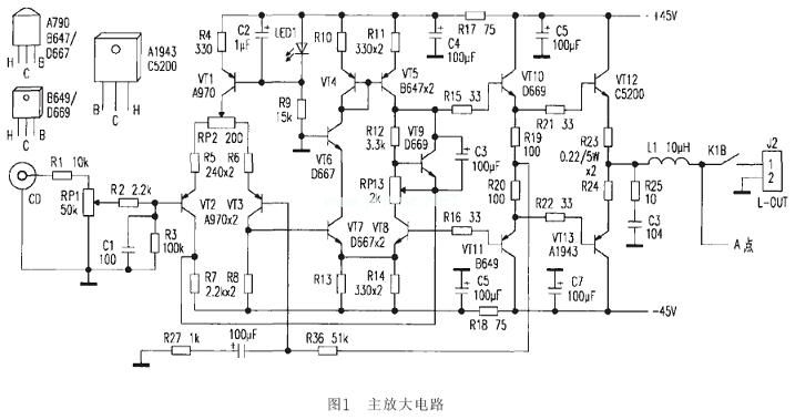 接上功率输出级,微调RP3将VT12、VT13静态电流调到80mA,R23、R24上的电压降各为17.6mV。测量功率输出级对称中点(即R23、R24连接处)的直流电压,如果VT12、VT13对称性不好则该点电压静态时可能不为零,同样调节RP2将该点电压控制在±5mV以内。至此,整机制作基本成功.接下来就是加音源试听调试了,有条件的话可以用示波器观测整机的波形及频带宽度。