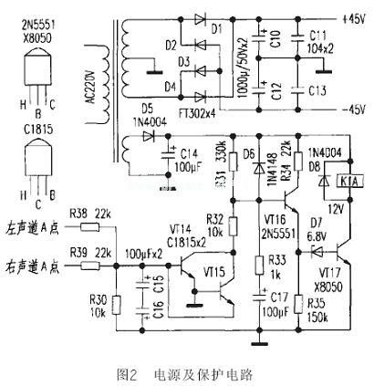 图2是功率放大器的电源及保护电路.在此只对保护电路作个简要介绍。保护电路具有开机延时及功率输出级中点直流过压保护的功能。刚开机时,右声道A点12V的保护电路供电电压经R31、R33向C17充电,此时VT16基极电压低,处于截止状态,并导致D7、VT17截止,继电器K1在开机瞬间不吸合,避开浪涌电流对扬声器的冲击。随着时间的推移,C17充电到一定程度VT16饱和导通,导致VT17也饱和导通,继电器K1吸合,完成开机延时过程。