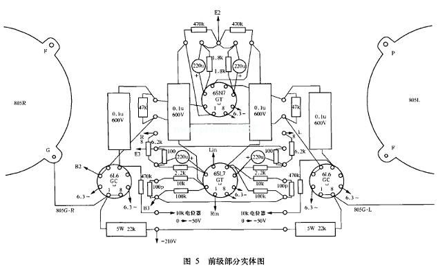 前级电路输入级6SL7GT、推动级6SN7GT和阴极输出推动级6L6GC三管电路使用元件较多,采用搭棚方式,由3只接线架完成,力求元件单层布置,疏密得当,实体图如图5。所用阻容元件都是通过计算或查应用图表获取,并已装机检测证实。音量电位器使用ALPS100KA×2,电阻未标注功率的均为1/2W ,100pF带通滤波电容宜用云母介质的。4只耦合电容均使用斯碧维他命0.1 600V油浸纸介电容。6L6GC阴极电阻22kΩ/5W 实际功耗2.2W请使用耐热的金属膜电阻,可靠性要高,一旦断线将使FU-5板流大增而发红,危及功放管安全。它接于-210V电源端给阴极输出器提供一个10mA的静态电流,可使推动内阻低且失真小。FU-5的灯丝平衡电位器用100 Ω线绕的大于2W即可,电位器手柄穿底板上只能使用内磁式,否则将产生较大误差。该电流表中通过的电流为板流加栅流,所以大动态时,电流表指针向上摆动属正常情况。这一点与甲类输出管不同,而中等音量以下栅流近似于零,电表指示则为板流。电流表满度电流可选用125~150mA规格。