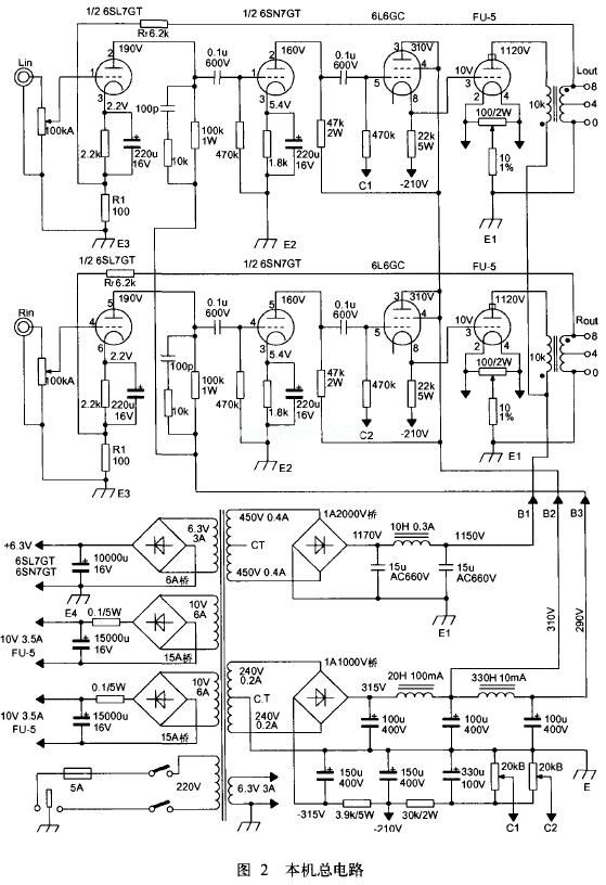 FU-5灯丝整流器可用一般10A桥堆,滤波电容C≥10/(ω·R),R=10/3.35=2.985 Ω ,故C=10/(314×2.985)=0.010669F=10669 uF,用15000 uF电容完成。100 Ω平衡电位器中点通地电阻10 Ω要用1%误差的五环电阻,有条件时还应装置电流表为好,因为无论更换FU-5或更换6L6GC都会影响FU-5板流变动,有电流表时可方便调整板流。在信噪比非常高时前级灯丝直流供电的重要性便凸显出来,不过直流供电仅供V1、V2两级电压放大管灯丝,而阴极输出器6L6GC则为交流电供灯丝,与信噪比无关。这样可以减小整流滤波负担,再则若更换6L6GC为EL34作阴极输出推动管时,不会因为灯丝电流加大而影响整流输出电压。用高跨导管EL34作阴极输出推动管时内阻约为100 Ω。
