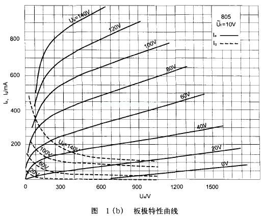 乙类功率管和甲类功率管是有很大区别的,甲类功率三极管一般栅负压较深,最大板流时栅压为零,在整个放大区内不产生栅流,理论上输入阻抗为无穷大。板极内阻较小,电路对扬声器有较大的阻尼系数。栅极对板极电压放大系数很小,是所谓低μ管。如2A3、300B、211、845等。而乙类功率三极管,栅负偏压较浅,甚至为正栅偏压,在整个放大区内,栅压在正栅压与负栅压之间交替变化,并且在正栅压范围中有相当幅度的摆动,产生栅流。该栅流随板压变化而变化,与栅压不成正比,呈非线性状态。板极内阻普遍较大,功放对扬声器的阻尼系数很小,一般为零点几。栅极对板极有很大的电压放大系数,μ常有60~200,是所谓高μ管。如805、806、809、810、8l1A、812A、833、838、572B等。其中838的各项参数与805相同,唯一不同的是板极由管脚引出,没有屏帽,都是乙类推挽功放用管。据说曙光厂也生产无屏帽的805,型号为FU-5A,即为838的全等管。805管约有11kΩ板内阻,μ值约为60。805管脚接线如图1(a)所示,板极特性曲线如图1(b)所示。板极最高工作电压1500V,最大板极损耗125W。