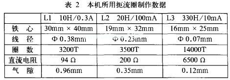 滤波电感可采用扩音机电源扼流圈,成品如飞跃150型的,规格为10H/0.43A,安装于底板上面。若自制,制作数据列于表2,注意其底筒与外壳必须具有高耐压绝缘,要能长期承受1500V电压才行。