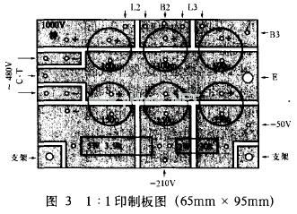 滤波后负载有4路,两路210V接6L6GC阴极电阻5W22 kΩ,另两路降压至-50V供两只20 kΩ电位器去控制左右声道6L6GC栅压,达到调整FU-5栅压的目的。两电位器手柄穿底板而上,在外面,方便更换FU-5或6L6GC时,调整FU-5板流之用。前级300V低压供电滤波电路及负压供电滤波电路集中在一块小印制电路板上,可使电路体积小、整洁。同时6只电容集中布置有利于星形接地,背景噪声最小。印制板如图3所示,其上E点为星形接地中心,因为要穿入多条接地导线,钻孔为Φ5.5mm。电路板通过支架立式安装于底板下在电源变压器与放大电路之间。