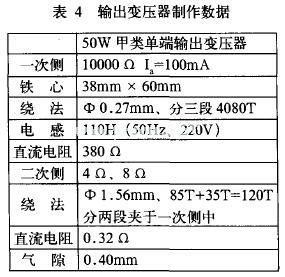 本机输出变压器是关键部件,一次侧与二次侧线圈相位相反,这是应电路负反馈要求。当然,若发生音频振荡时,可把一次侧B+与P接头对调即可。一次侧电感应大于110H (测试条件为220V/50Hz)。注意普通电感表所测电感为初始电感,其数值一般小于实际电感。本机所用输出变压器及电源变压器均由凯立厂定制。发烧友若想自制,表4给出了制作数据。一次侧分3段绕制,层间绝为0.08mm电缆纸,组间绝缘为电缆纸加聚酯薄膜加电缆纸三层结构。二次侧分两段夹在一次侧中。