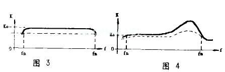 我们常用频率特性曲线来表示放大器的频率失真,所谓频率特性曲线就是放大器的放大倍数K与频率f的关系曲线。一个理想的没有频率失真的放大器,频率特性曲线是一条平行横轴的直线,如图3中的虚线。而Hi-Fi放大器的实际频率特性曲线,如图3中的实线。这条曲线表明,在(fn-fm)音频范围以内,放大倍数是均匀的,放大器所产生的频率失真很小。但是,变压器耦合的电压放大器频率特性就不是一条平坦的直线,如图4实线部分所示。随着频率的降低,变压器初级线圈的感抗要下降。变压器初级线圈两端的电压和次级线圈电压随着减小,放大器的放大倍数下降。随着频率的升高,在某一频率,可使Co(等效电容,它不但包括下级电子管的输入电容和接线的分布电容,还包括次级线圈的分布电容)与漏电感产生串联谐振,因此输出电压增高,放大倍数升高,出现峰值。频率再升高,由于Co所呈现的阻抗很小,放大量很快下降。