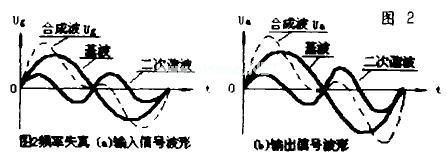放大器所要放大的信号在很多情况下并不是单纯的正弦波,比如语言,就是由许多频率不同的正弦波按一定比例关系叠加而成的,要使放大后的波形和输入的波形一样,就要求放大器对所有频率成分都有相同的放大倍数,如果对不同频率成分放大倍数不同,那么各频率分量之间原来的比例关系就发生变化,从而使输出波形与输入波形不一致。如图2所示:频率失真(a)表示栅极输入信号包含基波和二次谐波,图2(b)表示经过放大后的输出信号,它也有基波和二次谐波.但因放大器对二次谐波的放大倍数超过了对基波的放大倍数,因而经放大后的合成波形变形了,产生了频率失真。