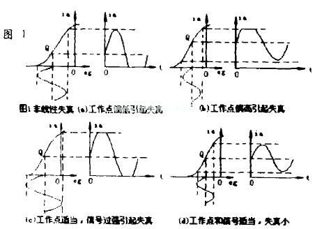 如图1所示:非线性失真(a)栅负压过大,工作点(Q)过低,使电子管工作到动特性曲线的下端弯曲部分,结果阳极电流的负半周变得扁平,产生显著的失真。图1(b)栅负压又太小,使电子管工作到动特性曲线上端弯曲部分,结果阳极电流的正半周变得扁平,产生失真。图1(c)栅负压虽然选得正确,但信号电压过强,因此阳极电流正半周、负半周都变得扁平,也出现失真。图1(d)栅负压和信号振幅选择适当,所以失真很小。