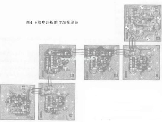 6块电路板焊好后,即可参照图4将它们连接起来。各电路板之间的连线长度取为5cm左右为宜,如果取得过短,则下一步难以将它们组装在一起,但也不宜取得过长而使连线变得过于松散,连接时应仔细参照图5所示的详细接线图,不要接错。