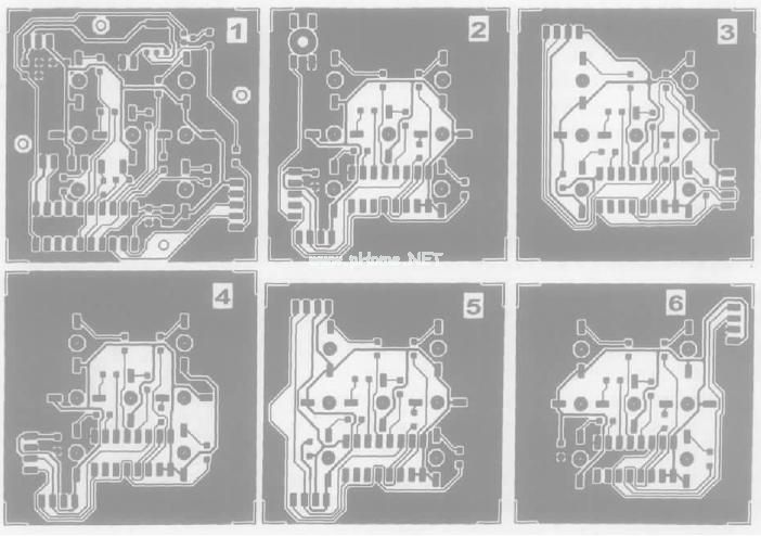 各电路板的制作与一般方法稍有不同。为了避免因元件引脚伸出电路板而导致骰子滚动时损坏家具表面,对6块电路板的大多数元件采用了表面安装式贴片元件,对它们的IC也采用表面安装式IC插座。为了缩短电路板之间的连线,6块电路板各有自己的印板图,见图7。其中,主电路板(即1号板)上的元件最多,2号板上装有按键开关S1,其余4块电路板的电路彼此相同,只是输入和输出插座的位置有所不同,因而它们的印板图也有所不同。