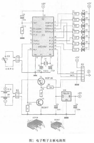 电源部分与常见的电路稍有不同,因为我们要用按键来使电路接通电源,而由微控制器自己来切断电源。这一功能是由晶体管T1、T2及其周边电路来实现的,K2是连接9V电池的插座.当按下2号电路板上的按键开关S1时(参看图2中的上图),就有小电流从+9V经晶体管T1的基/射结、电阻R8、K3和S1流到地,使T1导通,电池开始为三端稳压器78L05(IC2)供电,后者就对其余电路提供稳定的+5V电源电压。如果只是这样,则当松开按键S1时,上述电流不再流过R8,会使电路失去电源而停止工作,这就要求在投掷骰子的过程中一直保持按下S1,使用起来很难操作。为了解决这一问题,另外增加了电阻R9、R11和晶体管T2,并由微控制器来驱动T2,当电路接通电源时,微控制器使T2也导通,T1基极电流就经R9和T2流到地,不再依赖于按下S1,如果微控制器发现骰子有几分钟没有动过,它就停止驱动T2,使骰子自动切断电源,当再次按下S1时,上述过程又再次重复。