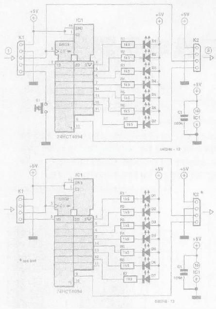 这些电路板的核心是一只74HCT4094移位寄存器(IC1)。该IC具有并行输出寄存器,它在时钟输入信号的每个上升沿使IC里的8位数据移动1位,并使第1位取值为输入数据,最后1位则通过该IC的⑨脚移出到下一块电路板上移位寄存器的数据输入端,这样就有效地将所有电路板变成了一个庞大的移位寄存器。