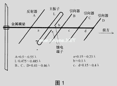 由于八木天线的增益与轴向长度(从反射器到最末引向器的距离)、单元数目、振子长度及间距密切相关,轴向越长,单元数实际也就是引向器越多,方向越尖锐,增益越高,作用距离越远,但超过四个引向器后,改善效果就不太明显了,而体积、重量、制作成本则大幅增加,对材料强度要求也更严格,同时导致工作频带更窄。一般情况下采用6~12单元就足够了,天线增益可达10~15dB,对于高增益的要求,可采用天线阵的办法加以解决。引向器的长度通常为(0.41~0.46)λ,单元数愈多,引向器的最佳长度也就愈短,如果要求工作频段较宽,引向器的长度也应取得短些。引向器的间距一般取(0.15~0.4)λ,大于0.4λ后天线增益将迅速下降,但第一引向器B和主振子的间距应略小于其它间距,例如取b≈0.1λ时,增益将会有所提高。