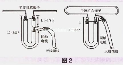 尤其值得一提的是,虽然大多数无线电通信机天线端口及采用的同轴电缆特性阻抗都设计成50Ω,而广播电视接收和传输同轴电缆特性阻抗为75Ω,但是对于任一天线,人们总可以通过阻抗调试,在要求频率范围内,使天馈线良好匹配,获得满意的驻波比。所以实用中并不十分注意八木天线输入阻抗的具体数值,而主要以馈线上的驻波比为依据进行尺寸选择或试验调整。如果选用同轴电缆馈电,为保证天线的对称性及与馈线的阻抗匹配,就必须在馈线和天线接口处加入“平衡一不平衡”转换器,例如半波U型环式匹配器、变压器式匹配器等,否则高频信号在传输中衰减严重。因半波U型环式匹配器只需一段λ/2的同轴电缆,结构简单,应用广泛,具体接线方法如图2所示。