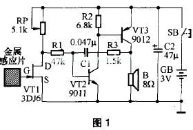 感应式测电器的电路如图1所示,它由高压感应控制电路和音响发生电路两大部分组成 其中:VT1是结型场效应晶体管,利用其高输入阻抗及电压放大特性作感应信号检拾和放大。VT2、VT3是两只极性相反的普通晶体三极管,VT3的发射结是VT2的负载,而VT2又为VT3提供基极电流,它们互相配合工作,在电容器C1、电阻器R3的正反馈作用下形成振荡,所以这个电路被叫做互补型自激多谐振荡器。