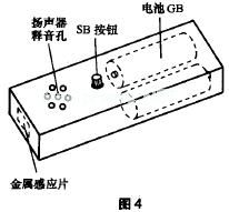 整个电路参照图4所示,全部装在一个尺寸约为110mm×32mm×20mm的绝缘小盒内。金属感应片用强力胶粘贴在盒子前侧面的内壁上,盒面板开孔固定电源开关SB,并事先为扬声器B开出释音孔。