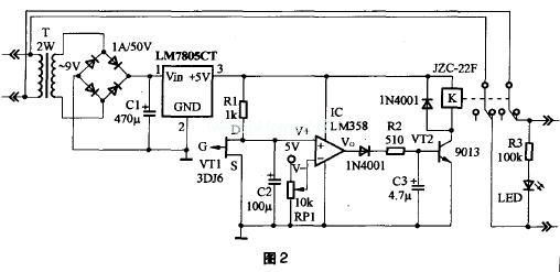 当拔插电源插头(指用电设备,见图1右侧部分)时,场效应管栅极G就会首先感应到人体的电信号,这时漏、源之间的电阻值增大,使V+>V-,运放输出端Vo由0变为1,VT2导通,继电器K立即吸合,两组动片均与常开点相连,而使常闭点连接的电源插座处于断电状态,电源指示灯LED熄灭。这样,即使人手触及到插头的金属部分也不会触电。C3作用为缓冲杂波干扰和积累一定的势垒电压,以提高继电器K吸合时的灵敏度。当插头插好,人手离开插座以后,场效应管感应不到人体的电信号(或感受度不够),电路就又恢复到正常工作状态,继电器重新释放,动片连接的外电源及零线再次提供给常闭接点连接的电源插座。