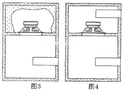 这种音箱比较少见,参见图3、图4,由图可以看出,它是在闭箱与倒相式音箱的基础上发展而来的.既有闭箱的设计痕迹,也有倒相式音箱的特征,其中图3所示音箱也有称四阶带通式音箱,图4所示音箱可以称之为六阶带通式音箱。