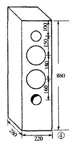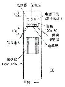 箱体采用15mm厚中密度板,选用倒相式结构,其制作方法同无源音箱(尺寸见图4),这里不再重复。所不同的是,其中一只音箱作为主音箱要作如下处理:(1)后箱板上要开二个孔,用于安装面板和散热器,开孔尺寸比面板和散热器每边各缩小1cm,便于固定螺丝。(2)箱内放置4根支撑木方,用于放置变压器。变压器放置在与扬声器保持一定距离并且靠近倒相孔的部位。