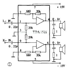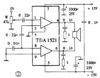 十年前功率集成电路主要用于中低档的组合音响中,随着集成电路技术的成熟,许多性能优异稳定可靠的大功率集成电路广泛应用于音频功率放大器中,取得了较好的效果。笔者曾分别制作过TDA1514A, LM1875和TDA1521等集成电路功放,其音质正如许多文章介绍的那样,均能达到发烧境界并各具特色。现介绍TDA1521集成电路功放,因该电路是飞利浦公司生产的高保真(Hi-Fi)双声道单片2x15W功率集成电路,特点是外围电路极其简单(部分外围电路元件已设计制作在集成块内),是一块“傻瓜”集成电路(见图1)。笔者将其双声道组成BTL电路,输出功率可达40W,可作为AV功放的主声道功放电路(见图2)。如双声道分别使用,则输出功率2×15W,可作为中间声道和环绕声道功放电路。因此该集成电路很适合无线电爱好者业余制作。