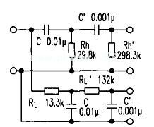 计算后面的一阶RC网络时,R值一般比它前面网络中的R值大(5~10)倍,电容值则小(1/5~1/10)。本例按10倍和1/10计算。后级的R'值对高通滤波器和低通滤波器分别为R'h和R'L: