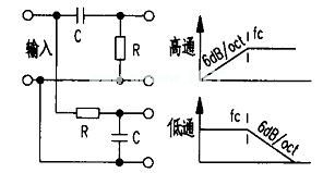 最简洁的电子分频网络只采用电阻R和电容C两种元件即可组成。图1为一阶二分频网络及其特性示意图