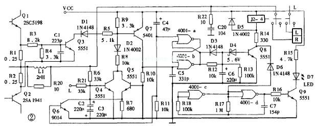 图2中由4001集成块中两个“或非”门和Q9、D7等组成的保护指示电路,4001-c、4001-d接成“非”门,与R17、R18、C7组成一个多谐振荡器。调整其阻容值,可以改变振荡器的振荡频率。振荡器输出的方波信号,经R16隔离,再通过Q9放大后驱动D7闪亮报警。D6是隔离二极管,在Q8饱和导通、继电器吸合、功放正常工作时,通过D6使4001-c的反馈电压到地,强迫振荡器停振,并使4001-d输出高电平。控制D7常亮。当Q8截止电路处在保护状态时,D6反向截止,避免Q8集电极的高电平影响振荡器的工作。