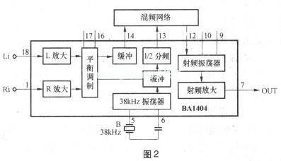 BA1404是专为调频立体声发射机设计的单片集成电路,18引脚双列直插式封装,内部电路结构如图2所示,它含有立体声放大器、平衡调制器、38kHz振荡器、射频振荡器、射频放大器等单元电路,接上少量外围元器件即可构成完整的立体声调制和发射电路,发射频率在88~108MHz调频广播范围内,由外接LC回路决定。