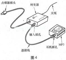 使用时的连接方法如图4所示。自制连接线的一端插入MP3播放器的耳机插孔,另一端插入本转发器的音频输入插座X。转发器的电源插头插入汽车点烟器,电源指示灯VD1应亮。开启MP3播放器,用汽车调频收音机应能搜索接收到MP3播放的立体声信号。如因车身屏蔽导致收不到时,可将转发器天线移近车窗玻璃,或为车上的调频收音机安装一车内天线。