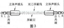 为便于MP3播放器与转发器的连接,应自制一根音频连接线。方法是用双芯屏蔽线将两个直径3.5mm的立体声插头连接起来,如图3所示,屏蔽线的两条芯线分别将两插头的R端与R端、L端与L端相连,屏蔽层将两插头的公共端相连,不可弄错。