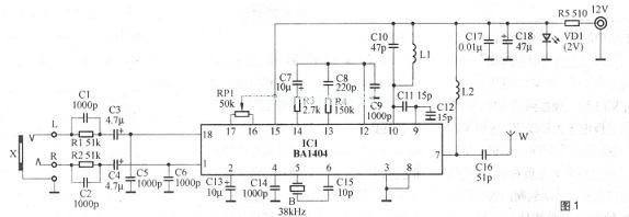 左、右声道音频信号分别由18脚、1脚输入IC1(BA1404),由内部的L、R放大器分别放大后,进入平衡调制器,调制后的立体声信号由14脚输出。R1、C1(R2、C2)构成时间常数为50 uS的输入端预加重网络, 以与调频收音机的频率特性相配合。C3、C4是输入耦合电容。