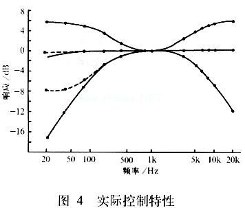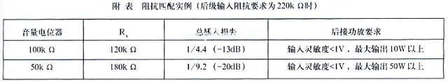 由此可见,后级输入阻抗(音量电位器阻值)越小,那么插入损失越大。因此在制作这个音调电路之前,必须根据现有功放的输入阻抗计算一下总插入损失,然后再检查一下这一损失对实际听音有多大影响。如果不进行这样的事先检查,有可能制作好的音调控制不能满足使用要求,从而造成不必要的浪费。附表是阻抗匹配的两个实例,可供参考。需要指出,这样匹配后的音量电位器是开得较大的,通常会达到13~15点(以时钟的时针指示音量刻度)。这与普通的音量指示位置(常在10~12点)相比,看起来有点不习惯。不过,只要最大听音音量能满足自己的要求就没有什么关系。如果看起来觉得不习惯,式(1)中的220kΩ也可改为100kΩ,即对后级的输入阻抗要求可以降低到100kΩ。这样对图4控制特性曲线的影响最大不超过1dB,完全可以满足要求。