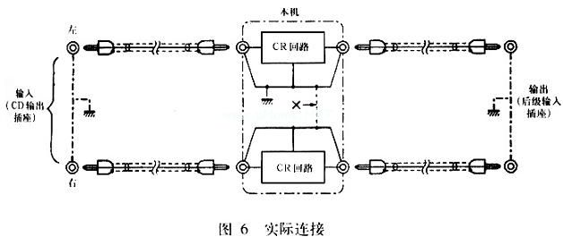 图5就是它的实际安装简图,图中只画出一个声道的接线。它采用一块双列接线板,一边各为一个声道的元件。音调控制电位器应采用线性电位器,这一点必须注意。机壳应采用铁板或铝板等导电良好的材料加工制作,大小不拘,只要安装得下即可。不过,对于喜欢动手制作的发烧友,不妨把机壳搞得大一些,以便日后需要时,也可以装入一些其他放大电路,即制作成有源形式的音调电路等。如果机壳是由几块平板拼接而成的话,应保证它们之间在电气上可靠相连,从而形成一个封闭的电磁屏障。所有接线包括输入、输出引线均不必采用屏蔽线。唯一要注意的是左、右声道的地线不应相连,并且只有一个声道的地线接地;另一声道的接地是通过与其相连的输入、输出馈线的屏蔽层来实现的,其情况如图6所示。机壳中“一点”接地的接地点安排在图5右边接线架的中间固定螺丝处,故该处务必仔细清除污垢,确保电气上可靠地接触良好。