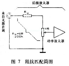 图7是进行这种阻抗匹配的简图。图中VR是功放本身的音量电位器,它的阻值可近似看作功放的输入阻抗。Rx就是阻抗匹配电阻。通常VR总是<220kΩ,为了满足输入阻抗i>220kΩ的要求,一般Rx应满足下式要求:Rx≥220kΩ-VR (1)