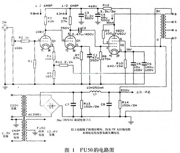 相对高驱动电压的电子管来说FU50的驱动电压要求并不是太高,但为了保证有足够的驱动力和较低的失真,本机电压驱动部分还是使用了两级放大来驱动FU50,前级输入放大管Ql(6N8P)为双三极管,Q1的一半作为信号放大,另一半管充当末级管的电压激励放大,即使用了两级共阴电压放大电路,该组合仍具有较强的电压放大能力I有着较好的频向和较好的相位特性。由于6N8P属于低“管,因此我们采用了两级共阴作为电压放大,使它能够产生足够的增益来达到驱动后级的目的。FU50是一个五极管,将它接成三极管的工作形式,它所需要的驱动电压虽然不算低,但该共阴组合完全能够满足该管驱动所需要的电压。由于6N8P的“值较低,用该管做电压放大时也较容易获取低失真的电压放大信号,并能有效地降低整机的失真度。由于共阴组合较适合用于音频放大电路中,因此也被国内外许多音响厂家广泛地运用。