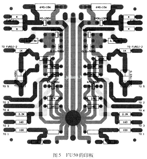 由于输出回路和电源线的工作电流比较大,如果离得过近极容易通过电磁感应在输入回路中’产生干扰。当灯丝采用交流供电时也极其容易产生电磁场使栅极回路产生感应电压而引起干扰,因此在布线中栅极必须远离灯丝的引线,并将灯丝引线绞合起来减少电磁场的干扰。同时栅极的引线越短越好,如果需要接长线的话,最好使用屏蔽线。在输入端的附近接机壳,这是消除交流噪声比较好的一种手段;信号流程要避免大小信号间的串扰,以提高声音的透明度。在制作过程中,既可以按照以上的原则进行搭棚焊接,也可以按照图5所示的电路板来制作,该印板为双面板的设计方式。本电路板在设计中既考虑到了FU50、KT88、KTl00等管的单端使用,同时也考虑到了2A3、300B等管的使用。因此该板也是一块多用途的功放板。